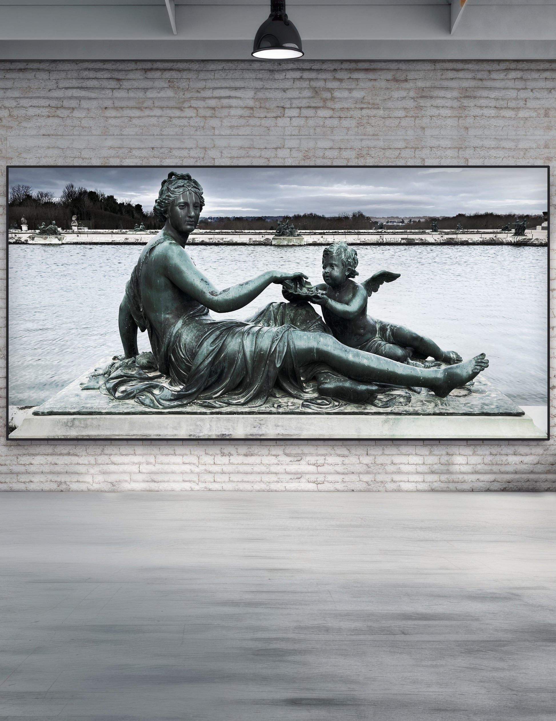 Dramatic monotone art piece of Sculpture within the gardens of Versailles.