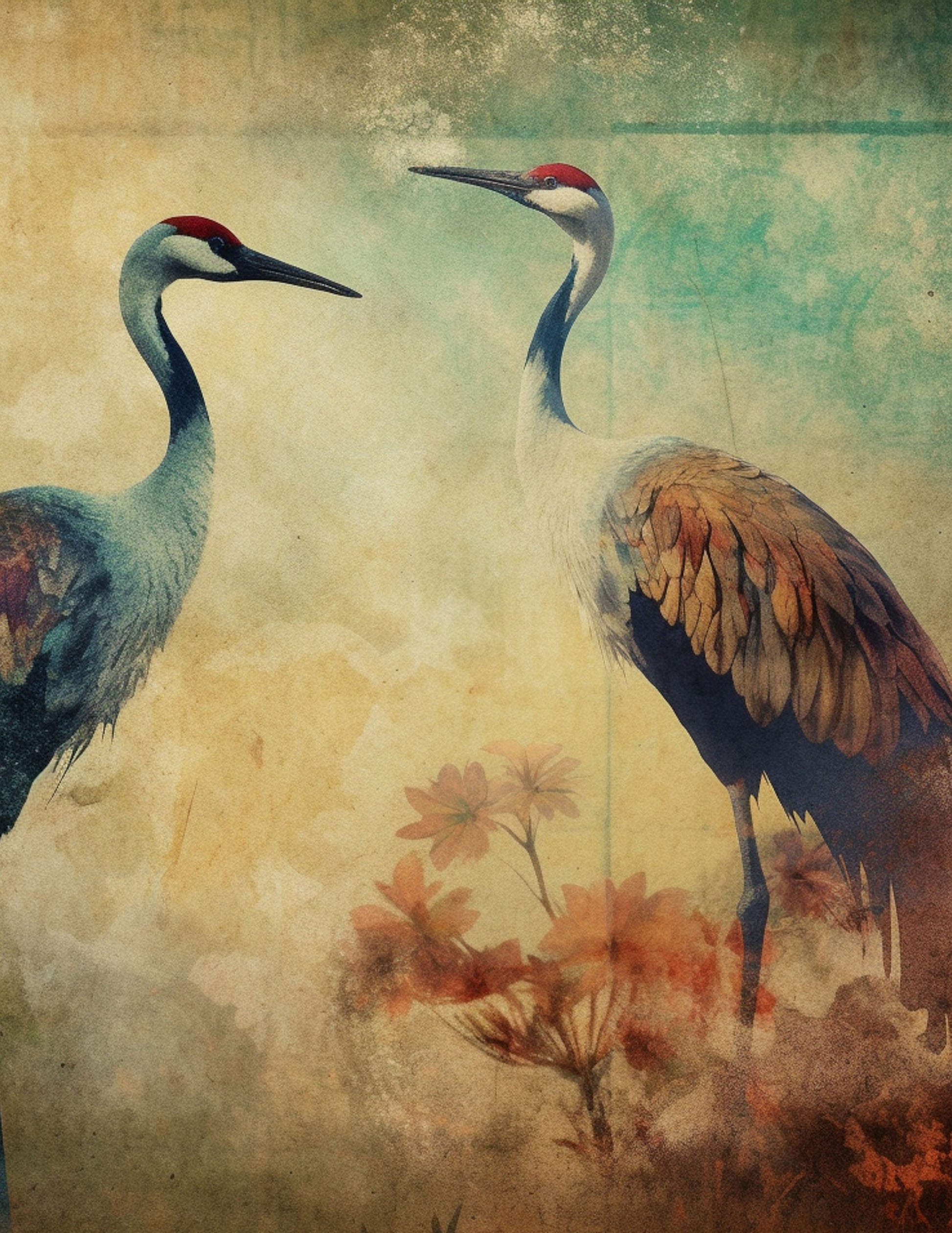 Striking vintage inspired art piece of cranes