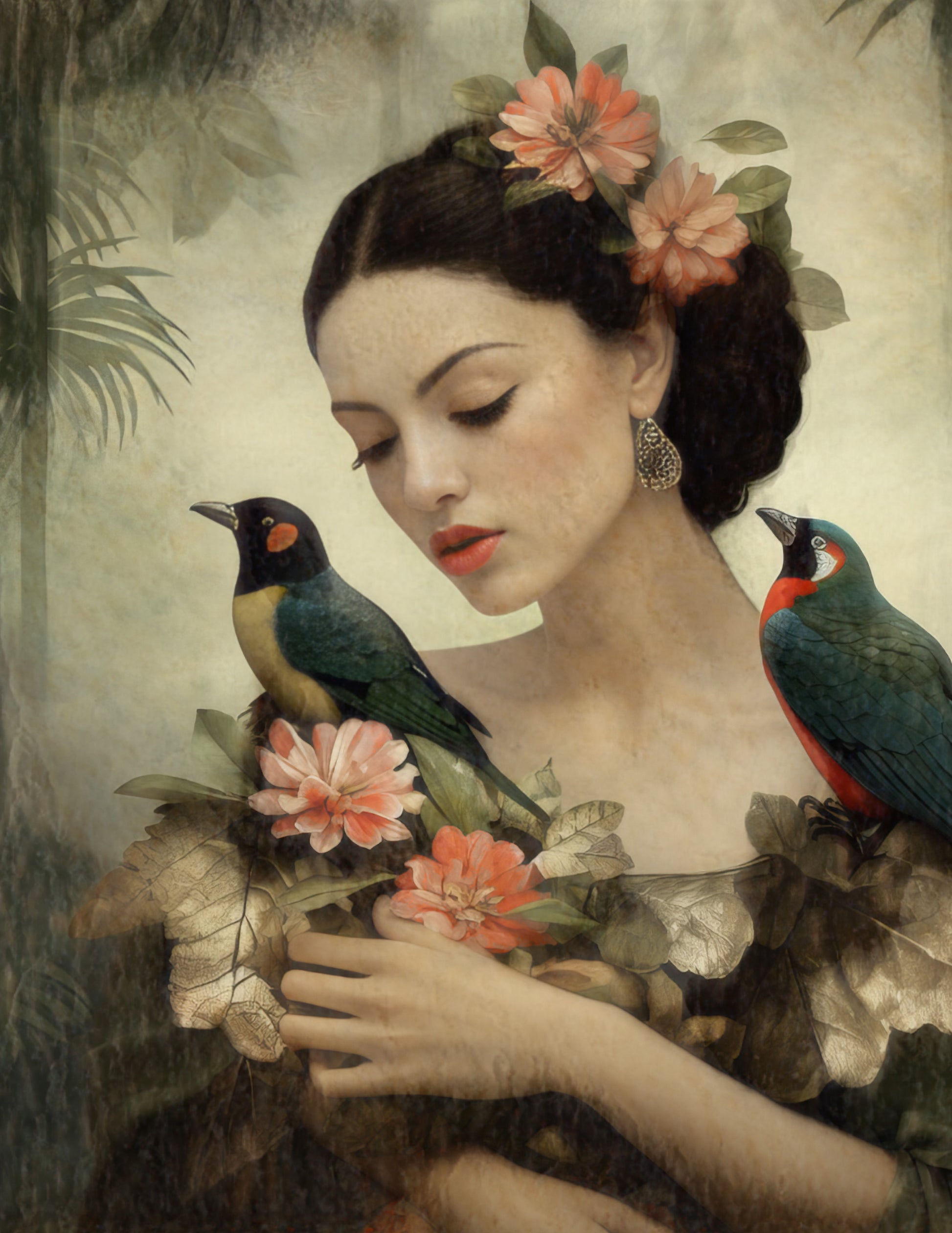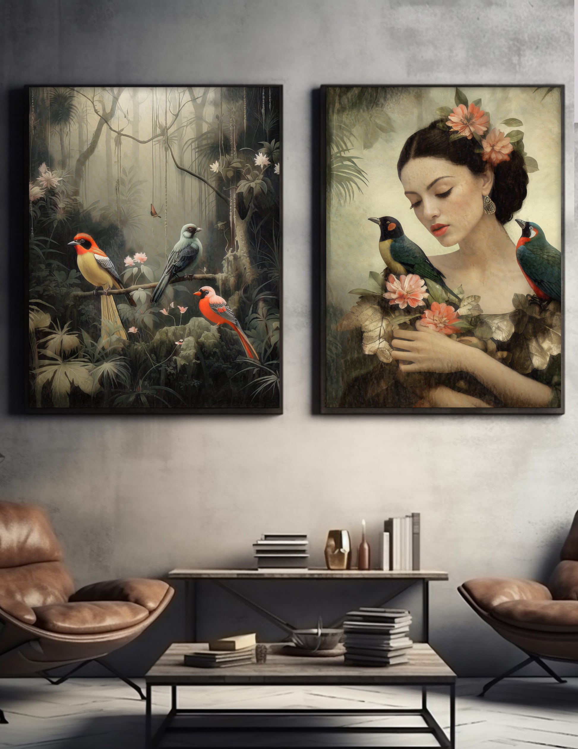 Vintage set of art prints of Tropical scene with birds and beautiful woman.