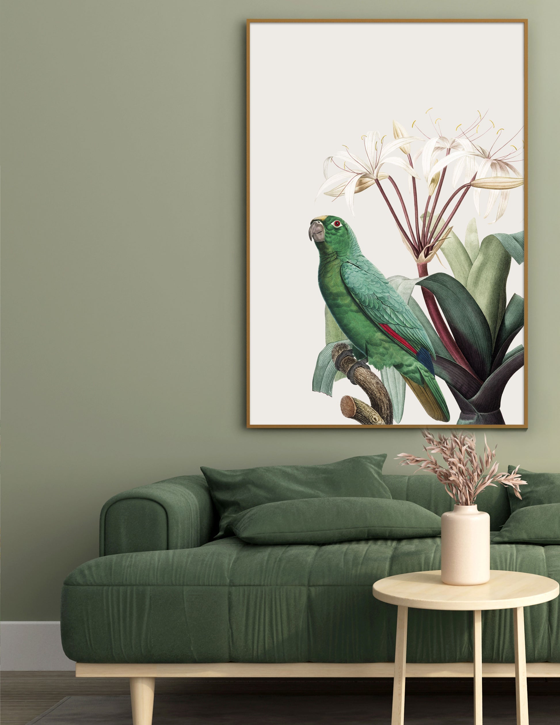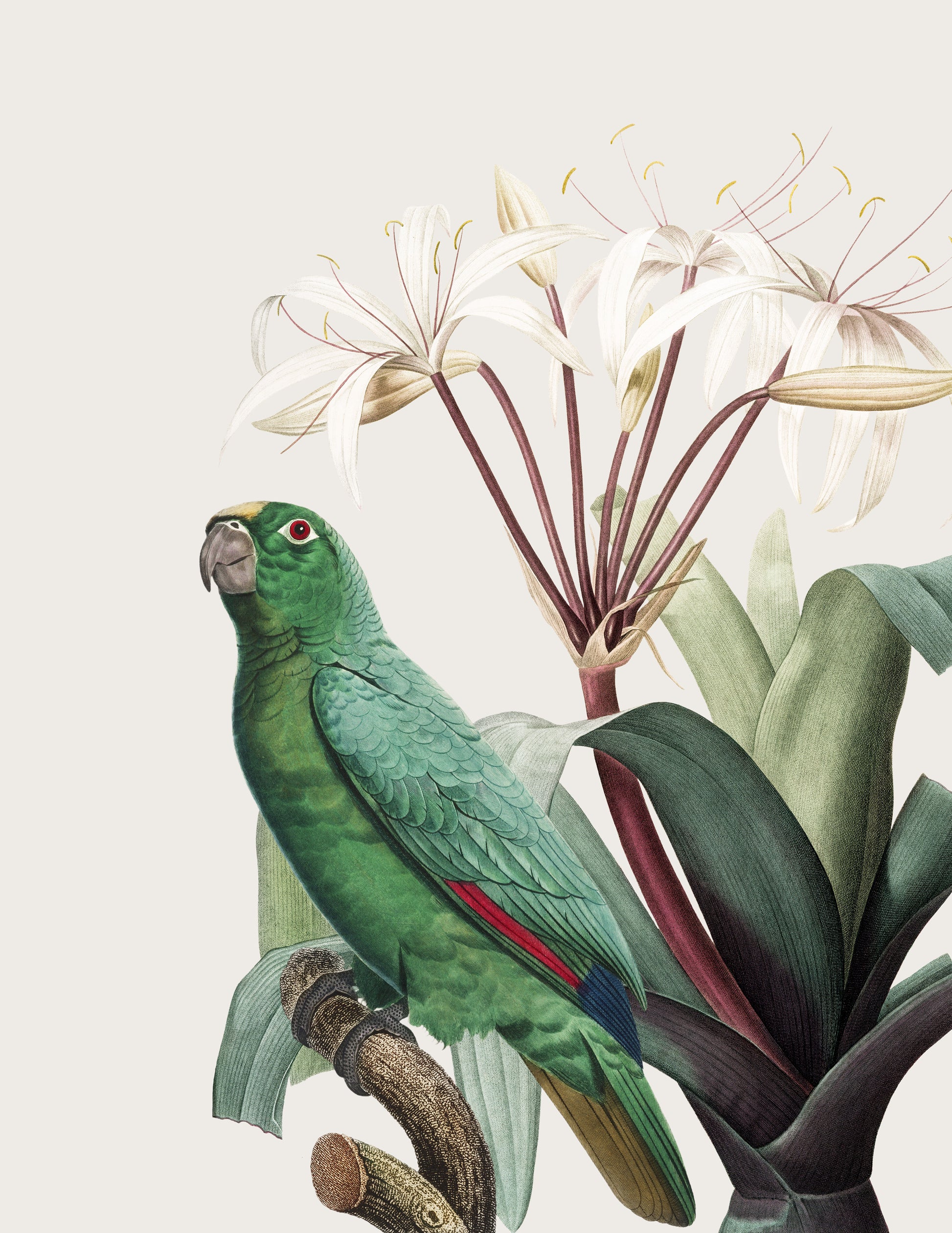 Vintage inspired art piece of a green toned bird sitting on a branch, on a simplistic off-white background