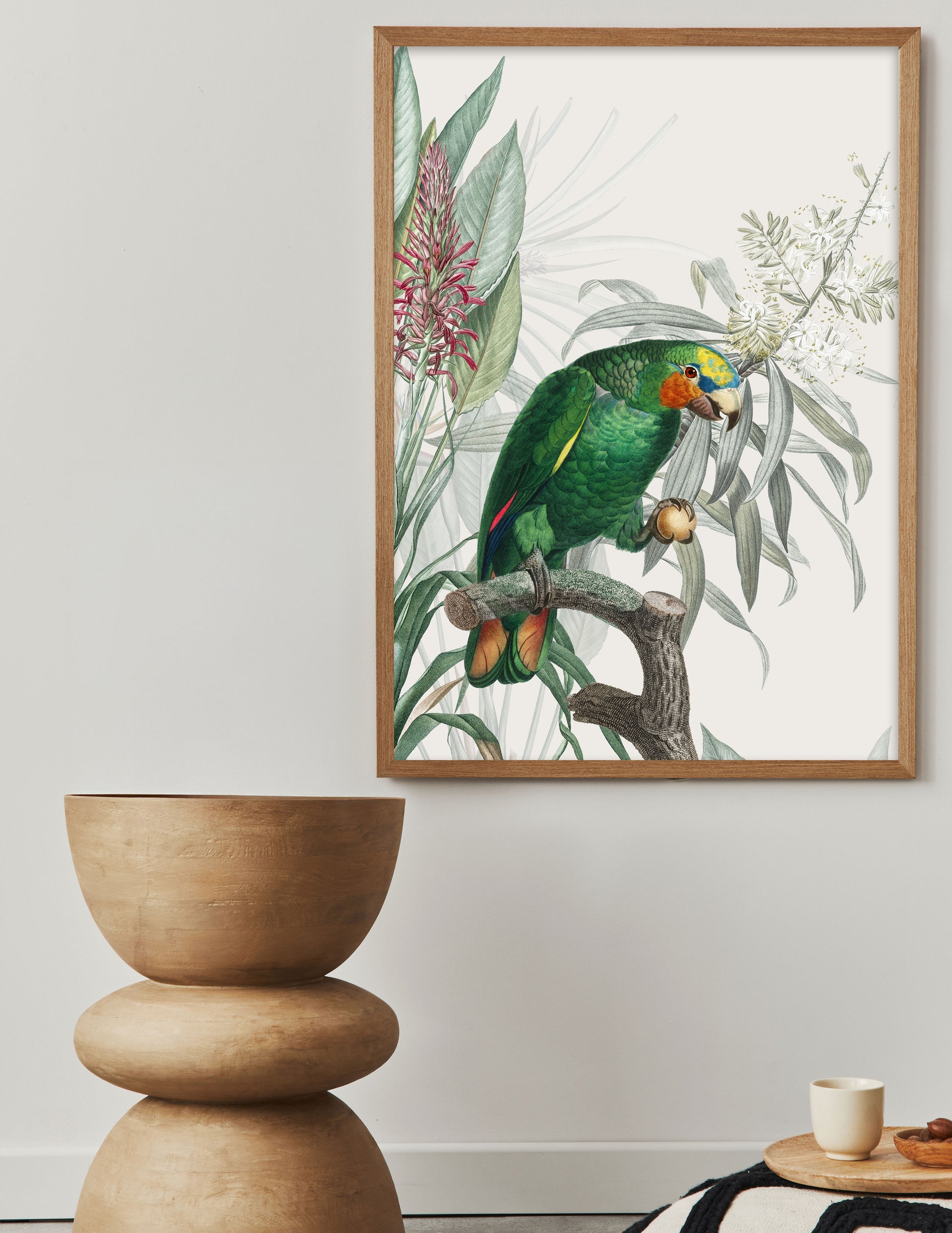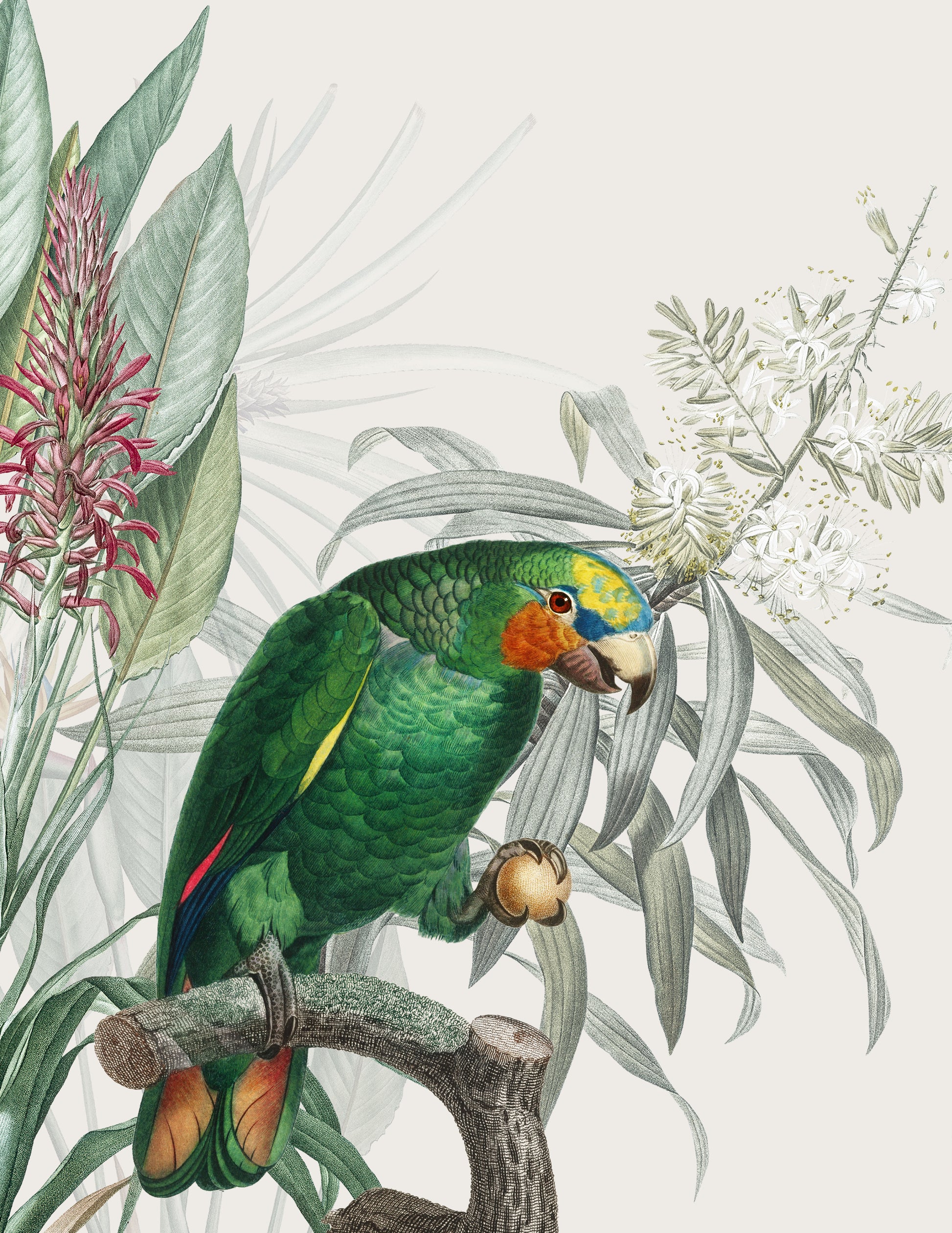 Vintage inspired art piece of a bird and plants on a simplistic off-white background