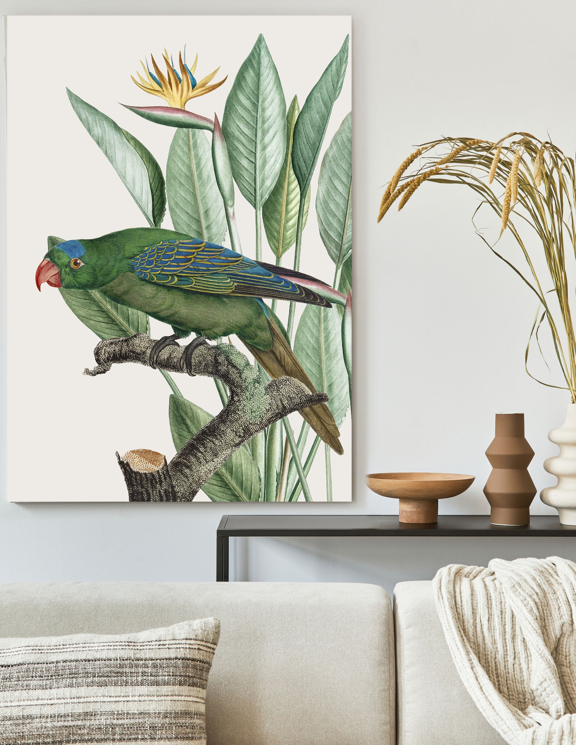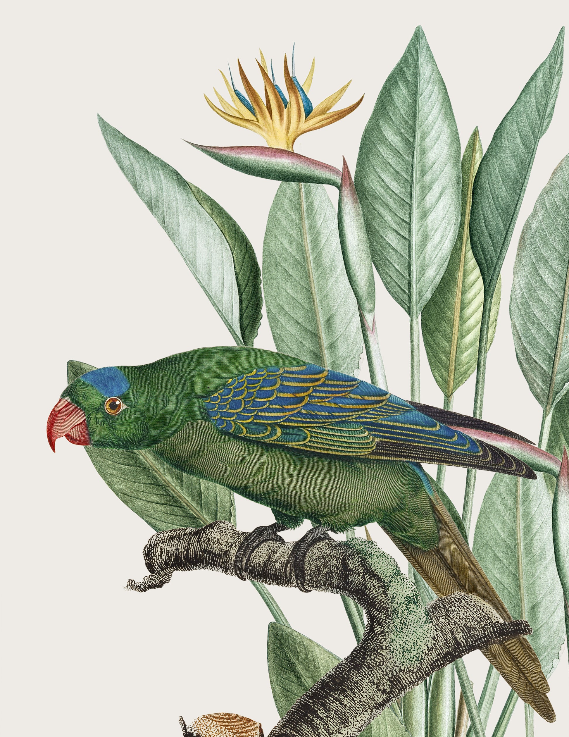 Vintage inspired art piece of a bird with 'Bird of Paradise' plant, on a simplistic off-white background