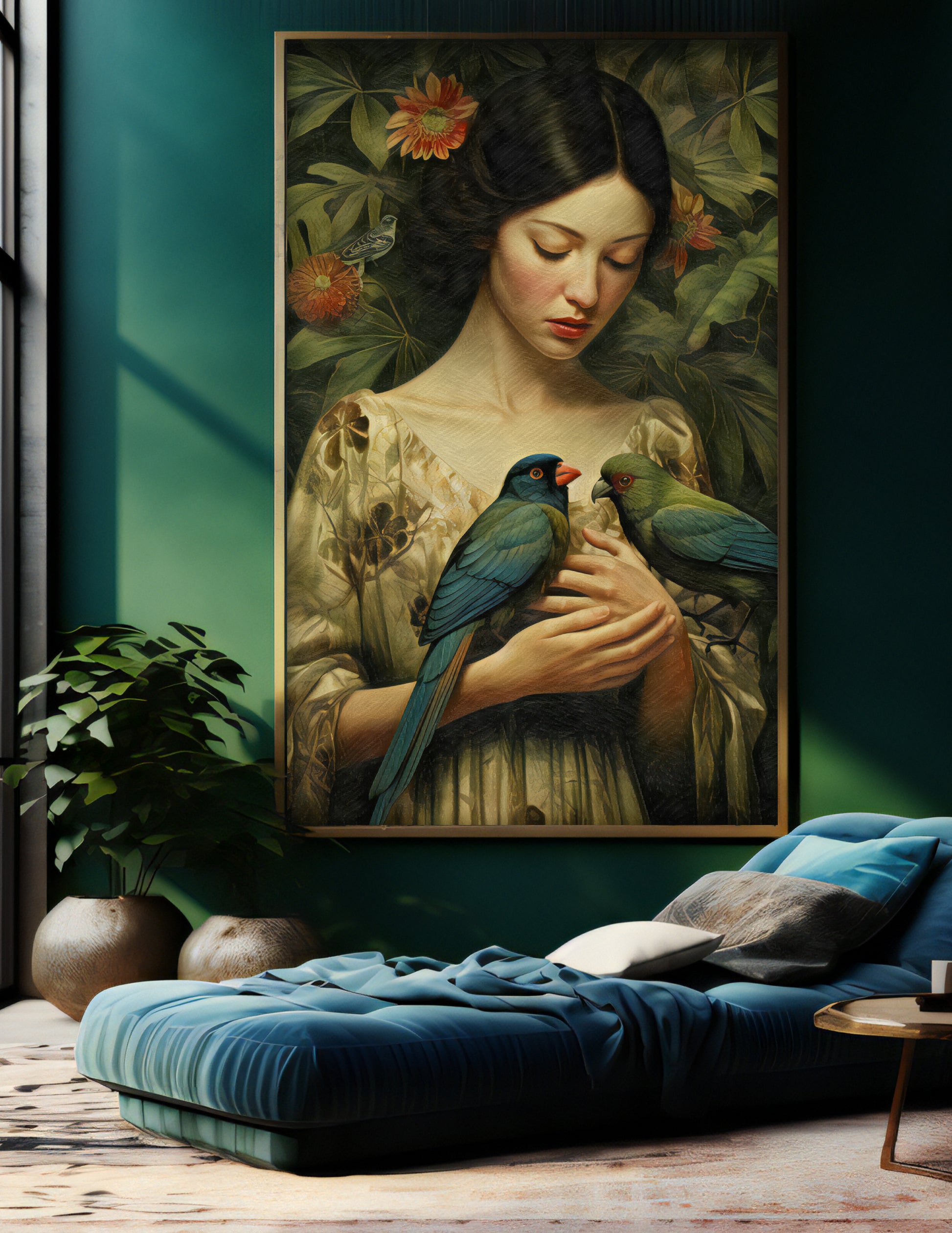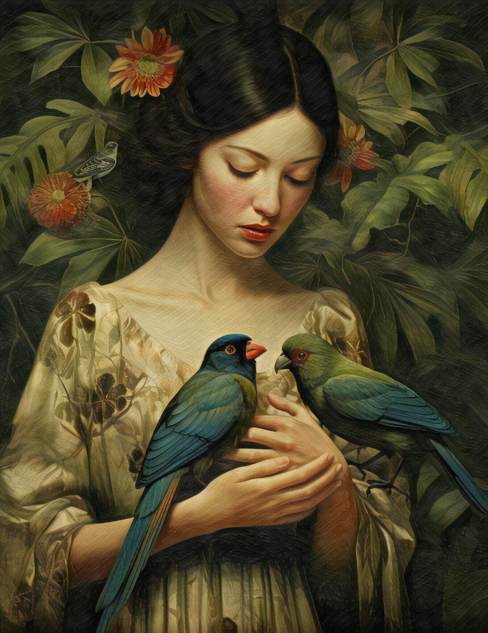Bohemian portrait of woman with holding birds.