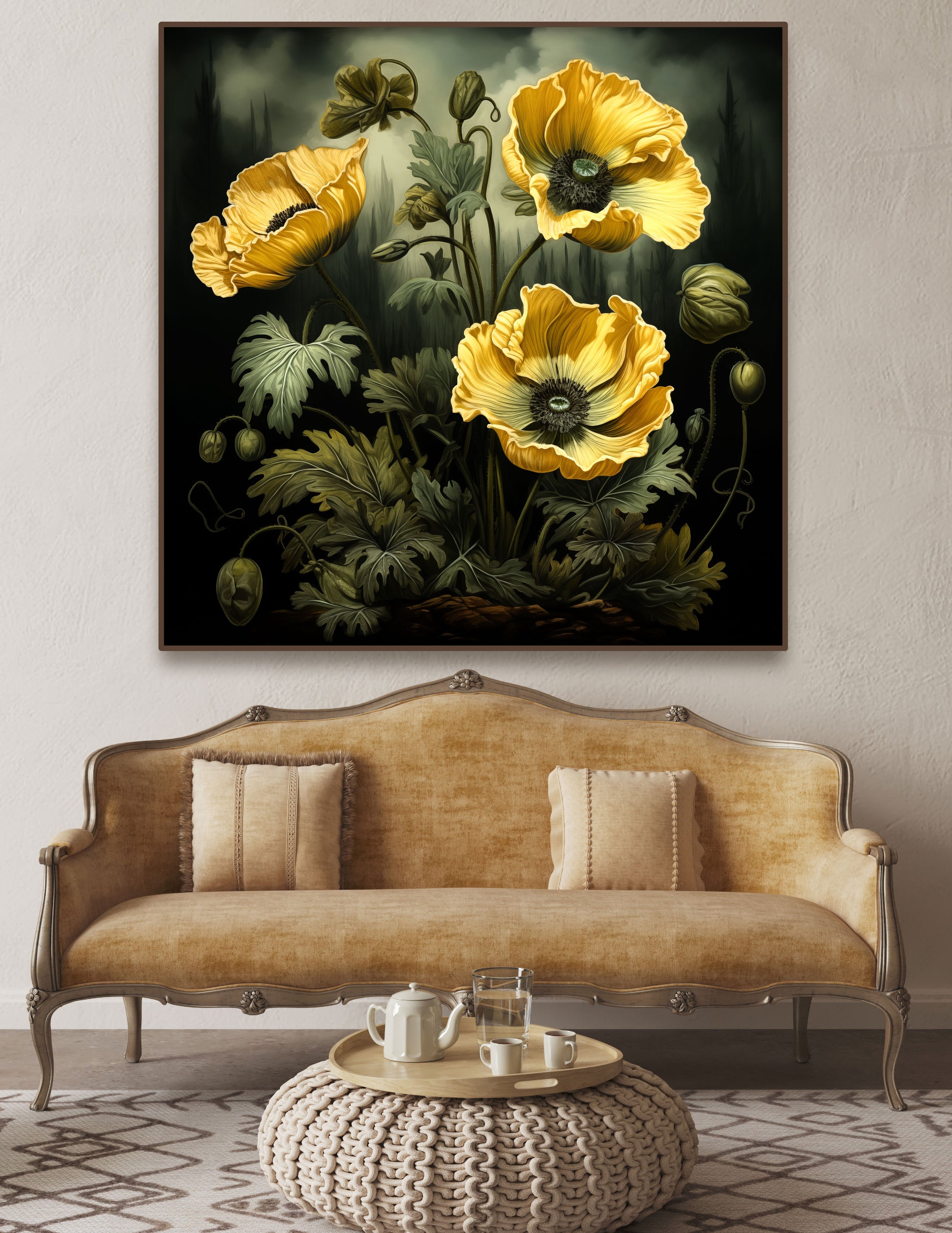 Vintage Bohemian art piece of yellow poppy flowers with dramatic backdrop.