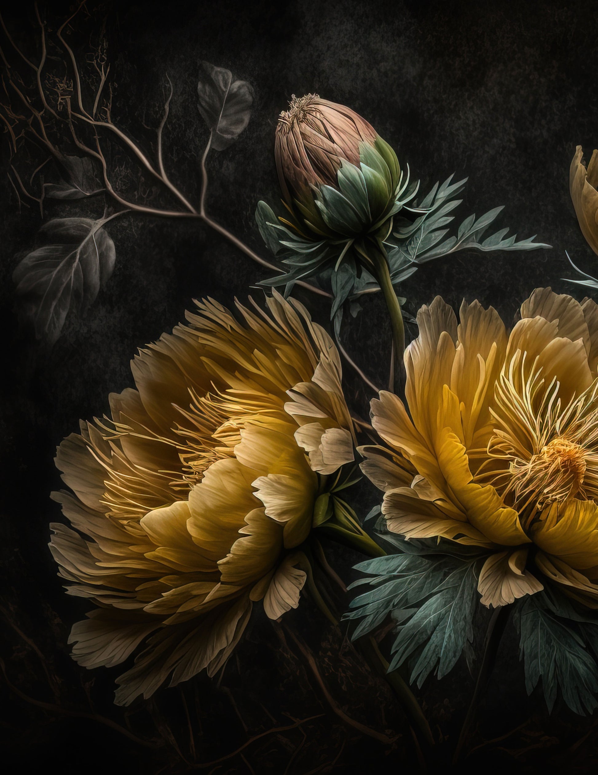 Soft portrait of florals in tones of vintage yellows on a dark background for a dramatic centerpiece.